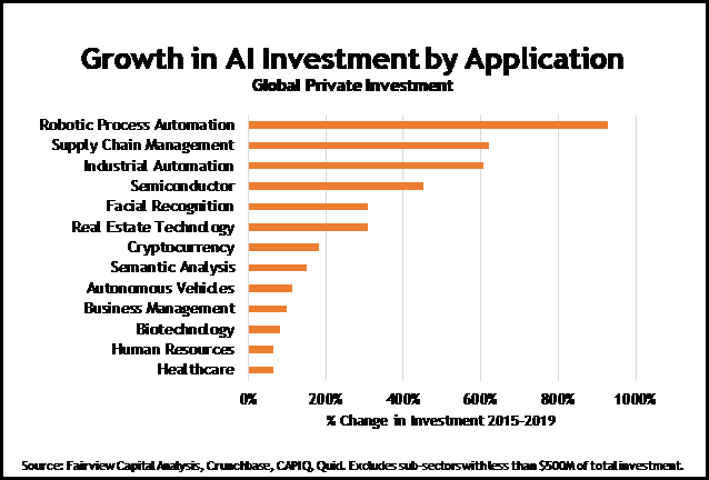 With AI infrastructure and tools more readily available to entrepreneurs, the scope of AI applications has increased. Applying AI represents the broadest opportunity set and the largest markets for investors. While autonomous driving has received the most investment historically, growth in recent years has come across horizontal and vertical applications such as robotic process automation (“RPA”), supply chain management, and industrial automation. These new or historically untapped markets are now much more accessible for AI software providers, creating growth opportunities for AI applications, particularly for repetitive tasks and predictable roles. Notably, a common theme is that, instead of replacing humans, the most effective automation aims to augment and improve human performance.