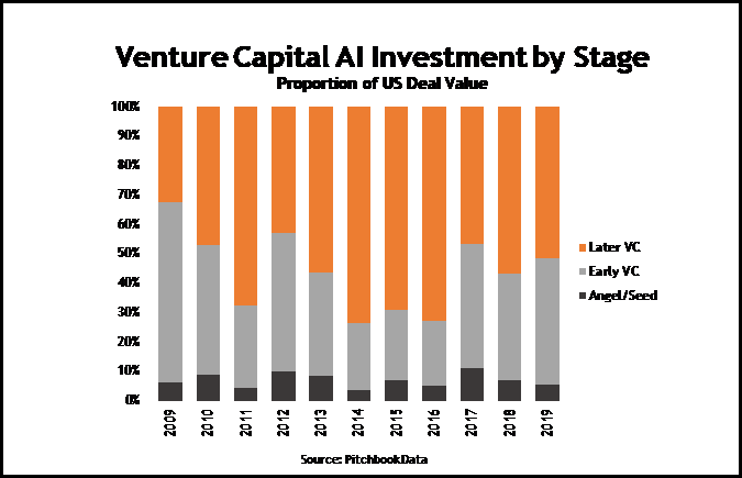 Later stage investment in AI companies has been noteworthy. Even though there is significant new company formation in the space, most of the capital has been flowing to mature AI companies. Emerging winners in this category have attracted capital because of their ability to capture substantial value as the infrastructure and enabling layers become more established. Early exit activity has supported this trend, with several large acquisitions in the space. For example, Intel recently acquired AI chipmaker Habana Labs for $2 billion in late 2019. Habana Labs had raised capital from firms such as Battery Ventures and Bessemer Venture Partners. The top acquirers of AI companies have been large tech companies such as Apple, Google, Microsoft, Facebook and Intel, primarily at the infrastructure and enabling layers.[3]