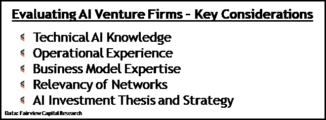 When investing in venture capital firms pursuing AI investments, limited partners should consider the relevancy of the firms’ experience, the technical and operational expertise resident at the firm, and its networks. The level and type of exposure, in terms of stage and AI technology layers, should also be considered. The approaches firms take can vary significantly and limited partners have several options for developing exposure to the category: