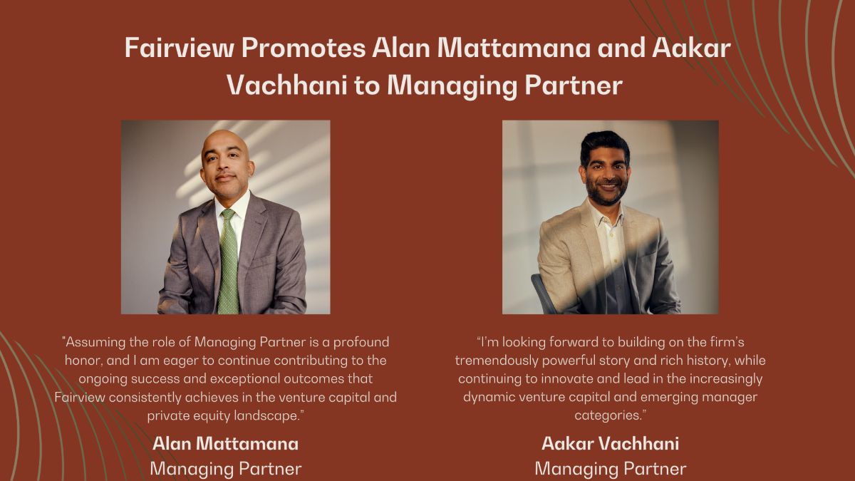 Mr. Mattamana and Mr. Vachhani were previously Partners at Fairview. In their expanded roles, both will continue to serve on the firm’s Investment Committee and play a vital part in investment selection, deal execution, and monitoring activities for Fairview’s venture capital and private equity partnership and direct co-investment portfolios. Additionally, they will join the current Managing Partners in the management and strategic leadership of the firm as Fairview continues to advance and grow.